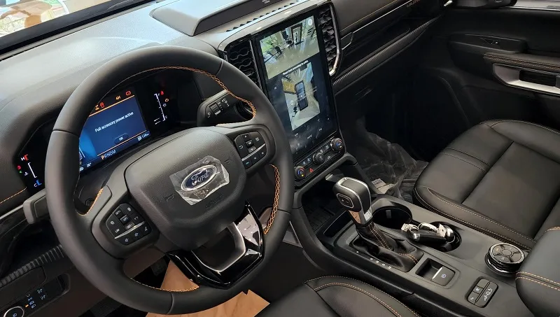 Khu vực lái là nơi thể hiện rõ đẳng cấp công nghệ của Ford Ranger. Vô lăng ba chấu được tinh chỉnh nhẹ, bọc da và phối chỉ màu nổi bật. Các phím chức năng được tích hợp đầy đủ trên bản Wildtrak và Sport.