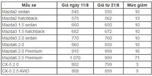 Cụ thể, các mẫu xe Mazda đã có những lần giảm giá chỉ trong thời gian ngắn, chẳng hạn như mẫu Mazda 6 phiên bản 2.5 đã giảm tới 71 triệu đồng. Những đợt giảm giá này thường diễn ra chỉ vỏn vẹn trong 10 ngày, gây ra sự biến động lớn trên thị trường và làm người tiêu dùng ngỡ ngàng.