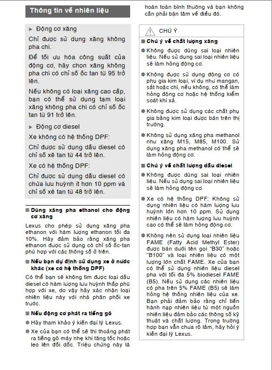 Một thông tin quan trọng được ghi rõ trong sách hướng dẫn sử dụng là Lexus RX 350 Premium hoàn toàn tương thích với xăng E10. Theo lộ trình của Chính phủ, từ ngày 01/06/2026, xăng sinh học E10 sẽ được áp dụng rộng rãi. Việc sở hữu một chiếc xe sang có thể vận hành ổn định, không ảnh hưởng đến độ bền động cơ khi dùng nhiên liệu mới là một lợi thế lớn cho chủ xe trong tương lai.
