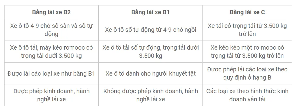 Về loại xe, bằng C có phạm vi rộng nhất khi cho phép lái xe tải trọng lớn. Bằng B1 và B2 giới hạn xe tải dưới 3.500 kg. Đây là điểm khác biệt quan trọng nhất về mặt chuyên môn và nghề nghiệp.