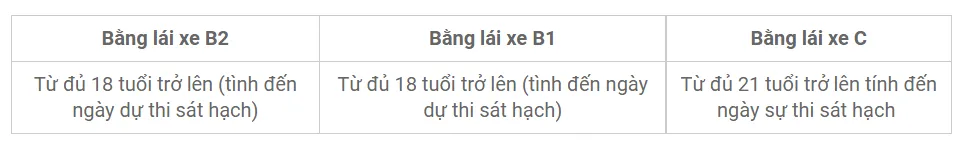 Về độ tuổi, người học lái xe ô tô bằng c phải đủ 21 tuổi trở lên tính đến ngày thi sát hạch. Đây là yêu cầu cao hơn so với bằng B1 và B2 (chỉ cần đủ 18 tuổi). Quy định này nhằm đảm bảo sự trưởng thành và trách nhiệm cần thiết khi điều khiển xe tải trọng lớn.