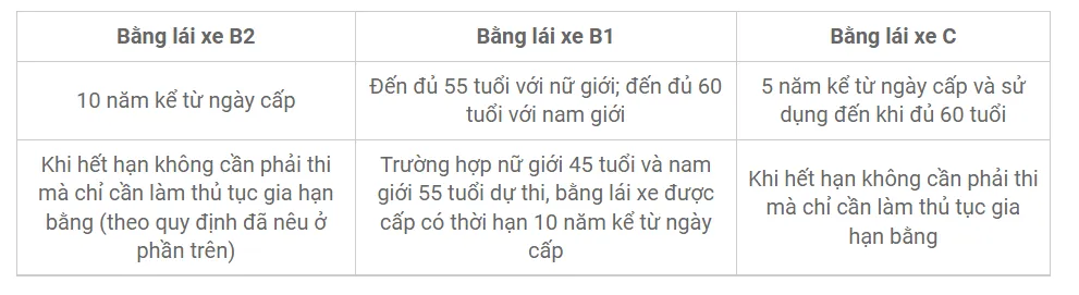 Về thời hạn sử dụng, bằng C có thời hạn là 05 năm kể từ ngày cấp, tương tự như bằng B2. Trong khi đó, bằng B1 có quy định khác nhau tùy thuộc vào người lái chuyên nghiệp hay không chuyên.