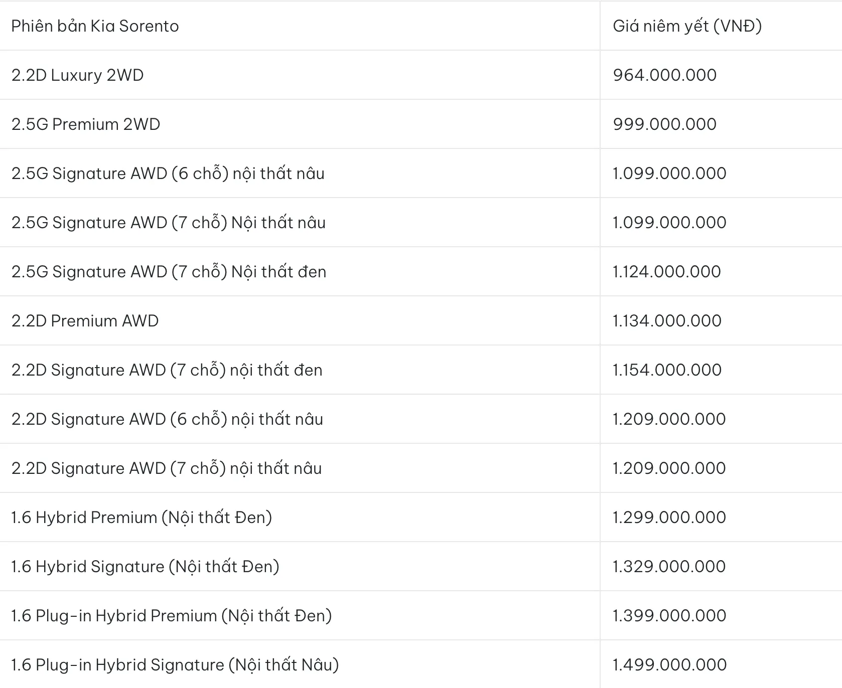 Kia Sorento thế hệ thứ 4 sở hữu ngoại hình nam tính và nội thất tràn ngập công nghệ. Xe cung cấp nhiều tùy chọn ghế ngồi (6 hoặc 7 chỗ) và đa dạng động cơ (Xăng, Dầu, Hybrid). Sorento là mẫu xe ô tô 1 tỷ khá toàn diện, nhưng chi phí bảo dưỡng định kỳ tại chính hãng Thaco đôi khi cao hơn một chút so với các dòng xe bình dân khác.