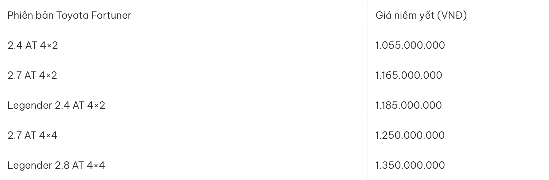 Đối với những khách hàng thường xuyên phải đi công trình hoặc vùng sâu vùng xa, Toyota Fortuner là cái tên không thể thay thế. Với khung gầm rời (Body-on-frame) và hệ dẫn động 2 cầu mạnh mẽ, Fortuner có thể vượt mọi địa hình khó. Đây là mẫu xe ô tô 1 tỷ có giá trị thanh khoản cực cao. Tuy nhiên, cảm giác lái của Fortuner khá thô cứng khi đi trong phố và độ trễ chân ga của động cơ dầu là điều người mua cần chấp nhận.